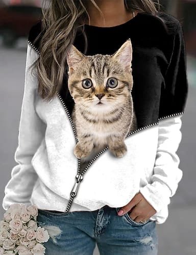 • Kadın uzun kollu bisiklet yaka kedi baskılı şardonlu dalgıç bluz