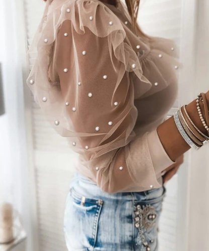 • Kadın uzun kollu inci detaylı tüllü viskon bluz