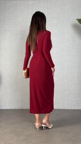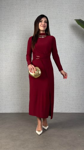 • Kadın balıkçı yaka toka detay sandy kumaş midi boy elbise