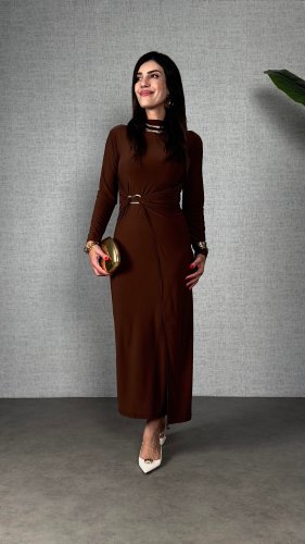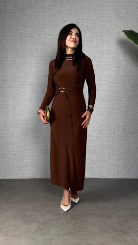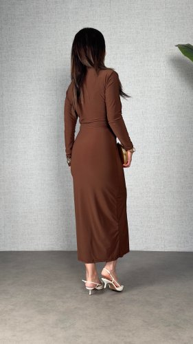 • Kadın balıkçı yaka toka detay sandy kumaş midi boy elbise