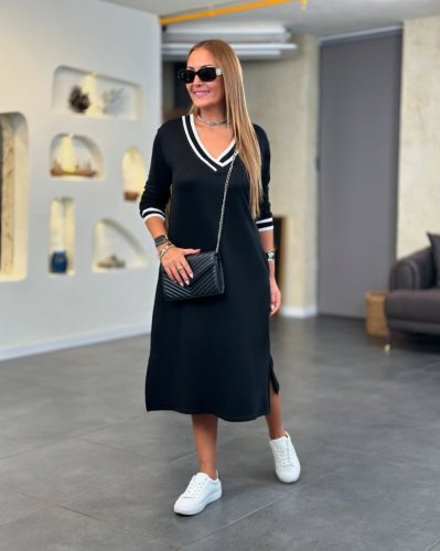 • Kadın uzun kollu v ribana yakalı yanlardan yırtmaçlı midi viskon iki iplik elbise