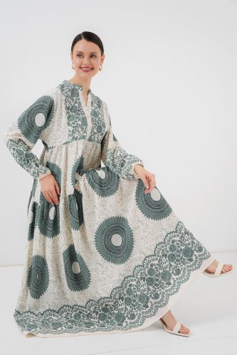 • 2423 Otantik Desenli Tesettür Elbise C Çağla